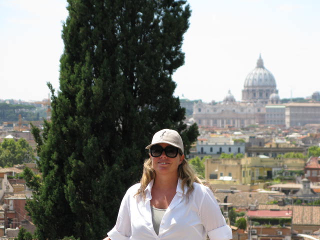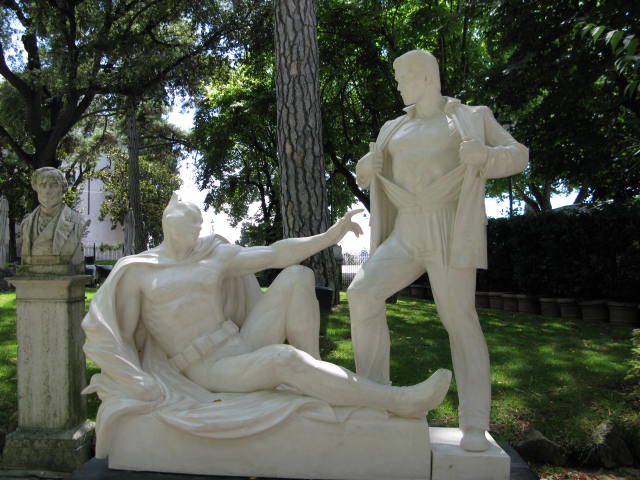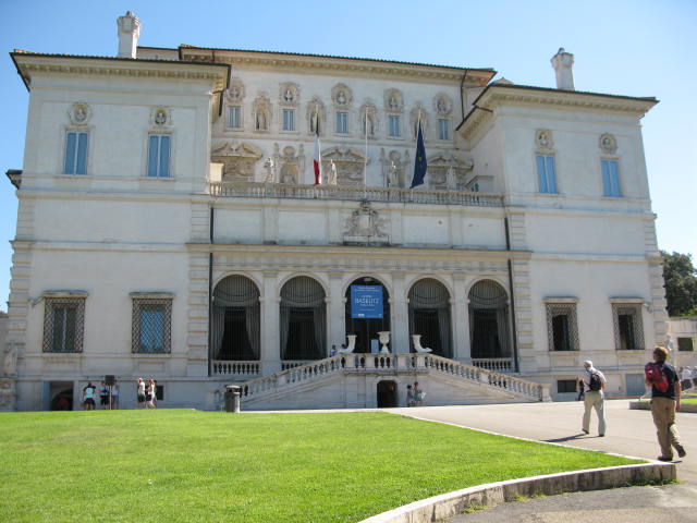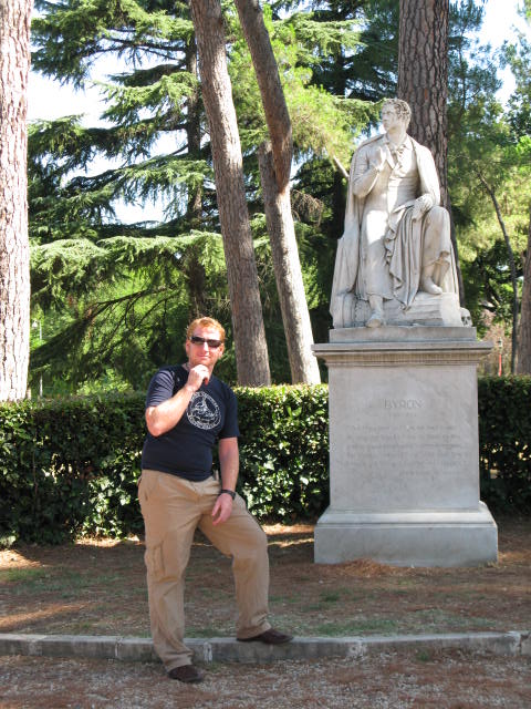 After spending a few days relaxing on the beach, checking out festas, keeping up the tan, eating yummy Italian dishes, and trying to remember to open my mouth and let the right language out after 3 months of Spanish, we decided to brave the sun and head down to Rome for the day, to villa borghese, to see the gallery, paintings, sculptures and a few beautiful Roman views. First stop was to admire the Byron statue, I think he wins vs. Loc for pensive nonchalantness (no I doubt it’s a word he used in his sonnets, but I think he should have…), Loc continues his impression of Byron below by kindly carrying my pink and purple bag…isn’t the villa Borghese just stunning…actually created with a gallery as it’s purpose and it sounds like the patron Scipione Borghese, was quite often a little unscrupulous about how he obtained some of the art, one particular painting he just blatantly stole, and it sounds like other acquisitions  involved various forms of bribery, nothing much has changed then…