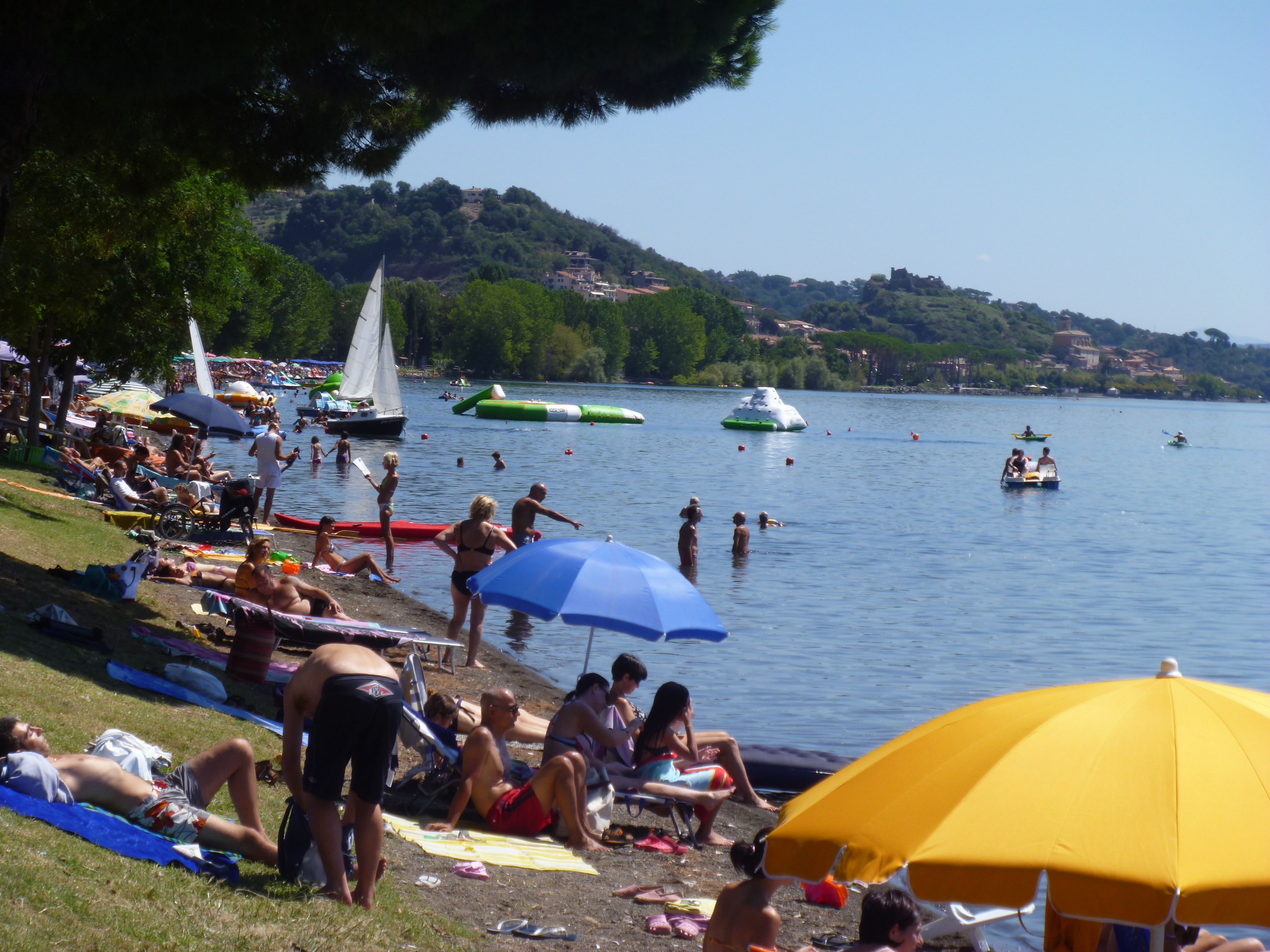 And so after a whistlestop tour of northern Portugal, we returned to European home, back to Trevignano, in peak season, and Loc’s first experience of the lake during summer, with around 3,000 Roman holiday makers, all squeezed onto the 1m deep beach. Just to set the scene, outside of the summer, there are generally 3 Trevignanese, the occasional fully kitted out in lycra round-the-lake cyclist and floppy the local village dog, have to put his photo in…
